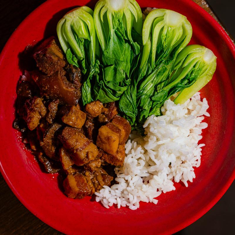Pork belly braised in a rich soy reduction served with bok choy, green onions over aromatic rice.